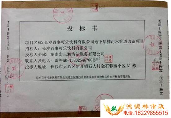 2013年10月18日,长沙百事可乐饮料有限公司,邀请我公司加入排水管道改建投标事宜。百事可乐公司在网上找到我公司,对比详细了解公司实力后,尤其是管道疏通清理这块,再看了公司的工程案例后,觉得宏三湘非常合适。此次公司高层管理人员非常重视,祝愿此次投标成功! (我公司工商现已经并更为 湖南鸿鹄林市政工程有限公司)