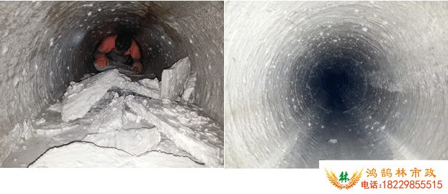 未清理前,管道中的泥石块 清理后,管道非常干净